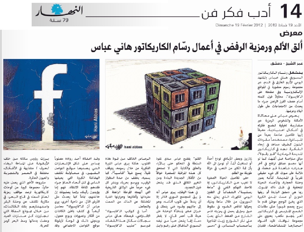 أما في كوكب الـ”فايسبوك” الافتراضي، فيصطاد هاني عباس سجالات سكان هذا الفضاء، فيرسم “صليب الـ”فايسبوك” وقد اعتلاه أحد رواده مصلوباً بمسامير على شكل الإشعارات التي يصدرها موقع التواصل الشهير، في محاولة لكشف الهشاشة الكبيرة التي يعيشها الناس في كل أنحاء العالم جراء فقدهم ثقافة الانتقاد. فهم إمّا يؤيدون رأيك، وإما يصلبونك إن خالفتهم، تماماً كما يحدث على الأرض الآن. من ناحية أخرى، يرى عباس أن للـ”فايسبوك” محاسن أيضاً في كشف باطن الكائنات من أفكار وتصورات وبوح خجول، ويتجلى ذلك في لوحة لأيقونة موقع التواصل الاجتماعي وقد برزت رؤوس سكانه من خلف الأيقونة على المساحة البيضاء لحرف f متشابهة في الأشكال، مختلفة في العمر والتجربة والعيون الحائرة.